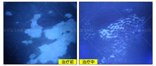 如果白癜风患者治疗前,白斑部位在伍德灯下是瓷白色的荧光,治疗后,白斑部位在伍德灯下是纯白色的荧光,说明黑色素有所增加,白癜风出现了恢复。同理,如果白斑部位在伍德灯下是纯白色的荧光,治疗后,白斑部位在伍德灯下是蓝白色的荧光,也是说明黑色素有所增加,白癜风有好转。明显好转后,伍德灯下可见荧光面积减小。(点我,查看白癜风治疗前后在伍德灯下的图片)