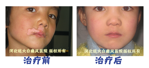 患者张X, 8岁, 河北衡水人。无意中发现嘴唇上部出现斑白,来到我院进行治疗。专家运用中医口服药与308nm准分子激光治疗仪进行治疗。2个疗程后白斑明显较少。现治疗中。