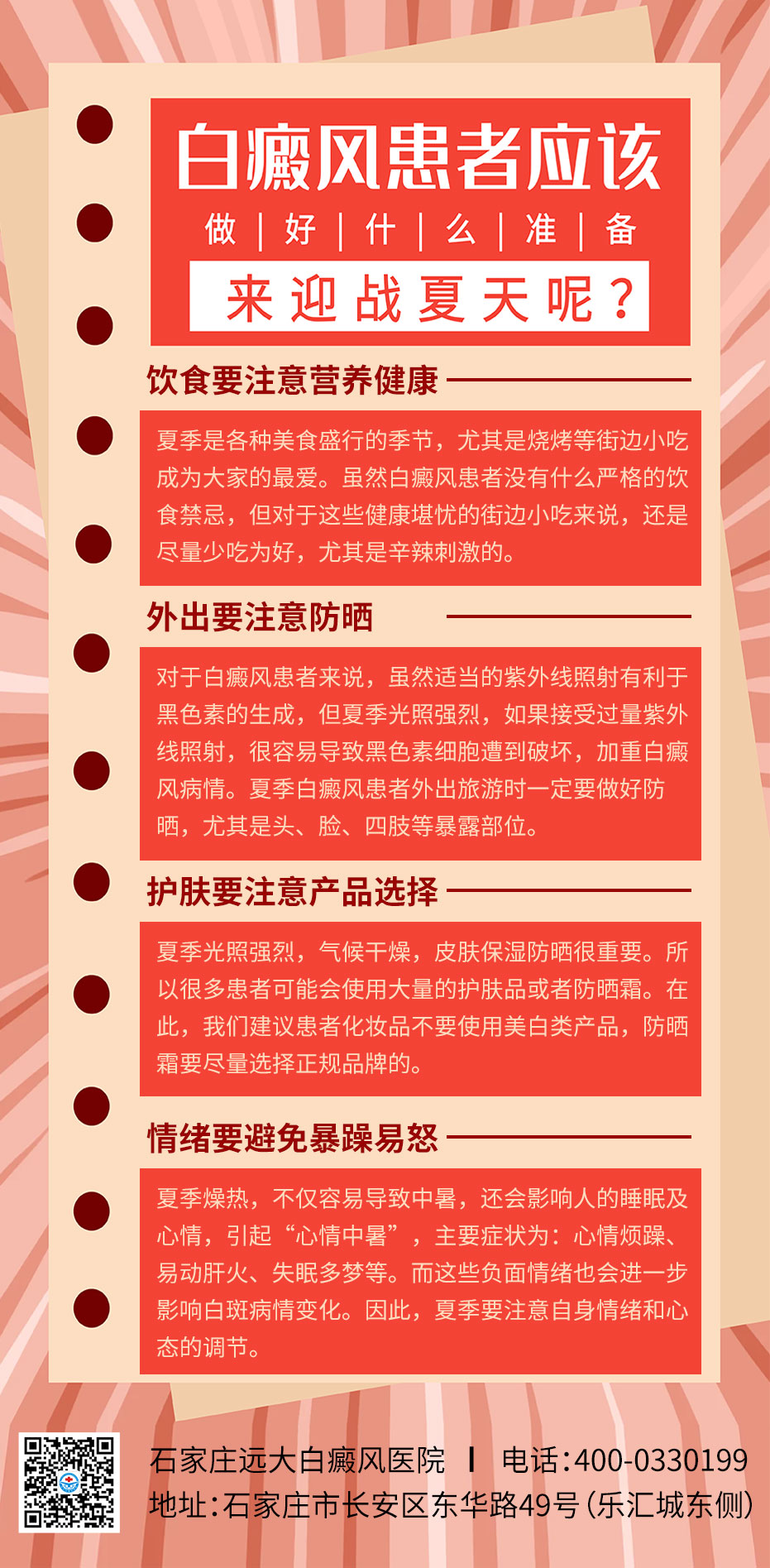 2、做好防晒措施。夏季室外温度较高、紫外线光比较强烈,白癜风患者一定要注意防晒。比如:涂抹一些温和的防晒霜,打遮阳伞、穿防晒衣等等。