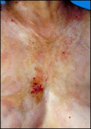 好发于颈侧,锁骨上窝、胸背上部,腹部特别是脐周、腋窝、手腕屈侧、皮损初为火柴头至豌豆大小,稍高出皮肤,平顶,呈角状粉红色丘疹,伴有明显的红色边缘,质地柔软,以后发展成为典型的硬化萎缩性苔藓。丘疹呈瓷白色、象牙色、黄色或珍珠母状,质地变得坚实,逐渐平伏。有时丘疹表面有小的角质栓塞性黑点,用力剥除后,留下一幽谷状凹陷。尚有不同程度的白斑,亦呈白色,边界清楚,常对称分布,损害发展到后期丘疹和斑片平伏,甚至下陷,呈羊皮纸样外观,一般无自觉症状,偶有轻度瘙痒。