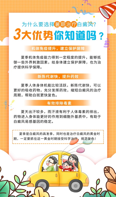 2. 夏天是身体的各个功能器官的旺盛时刻。此时治疗,可以迅速提高自身的免疫能力或修复素乱的免疫系统,这样治疗白癜风往往能起到事半功倍的效果。