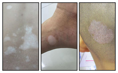 我们在这里为大家展示出了不同患者、不同部位的白斑图片。你身上的白斑是这样的吗?通过观察,可以总结出这些白斑存在的共性:表面光滑、皮肤平坦、皮损不粗糙、质地正常、形状各异、面积有大有小。白斑有这些特点或者大部分特征相似,以防万一,尽快做个检查,早日诊断清楚病症,将来不耽误治疗,也避免盲目误治。