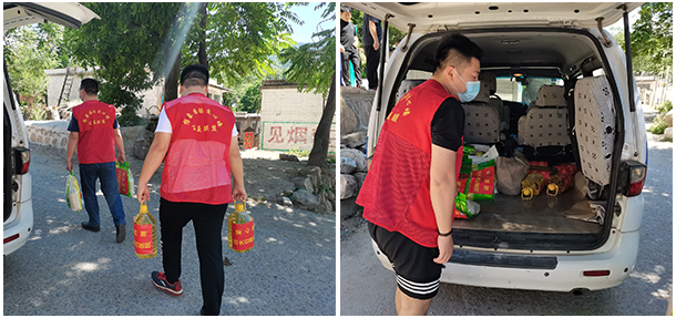 志愿者们经历几个小时的车程,到达目的地之后,开始搬运捐赠物资。每个志愿者忙碌且有序的进行着。