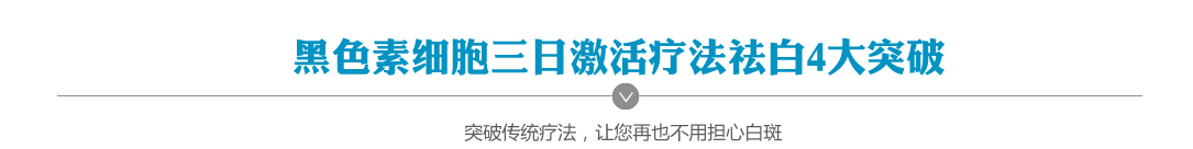 黑色素细胞三日激活疗法采用了先进的基因生物交互作用原理,利用低温效应,从患者自身细胞中分离出活性黑色素细胞,进行培养繁殖,将足量的黑色素细胞准确种植与白斑病灶,同时提供多种黑色素营养液,保证黑色素细胞成活、分裂、恢复自我养护功能,从而消除白癜风。