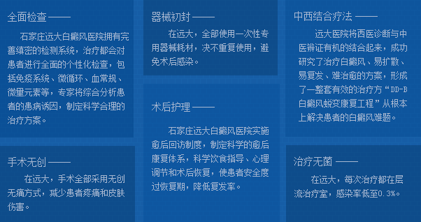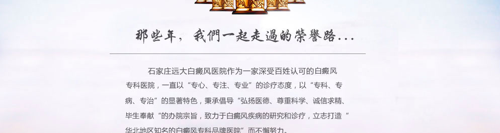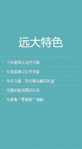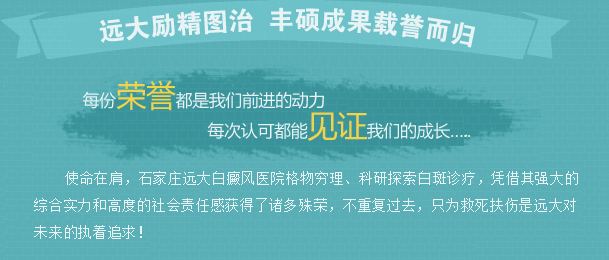 石家庄远大白癜风医院自成立起即以“人才为立院之本”,以“中医为本、西医为用,中西结合为诊疗原则”,注重医德医术的传承与发展。传承千年中医国粹,经过多年的研究与临床验证,我院在皮肤顽疾白癜风的诊治方面,别具特色,疗效显著。