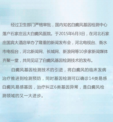 ⊙ 河北青少年白癜风专项援助基金 ⊙ 一封康复患者的内容独白 ⊙女性腿部白癜风康复案例… ⊙ 治好白癜风,孩子拥有快乐童年 ⊙没有白癜风,不再害怕出门了
